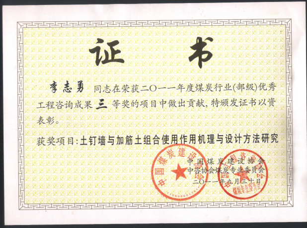 10.“预先脱泥无压给料重介旋流高效分选新工艺” 中国煤炭工业科学技术奖 三等奖(2007年)