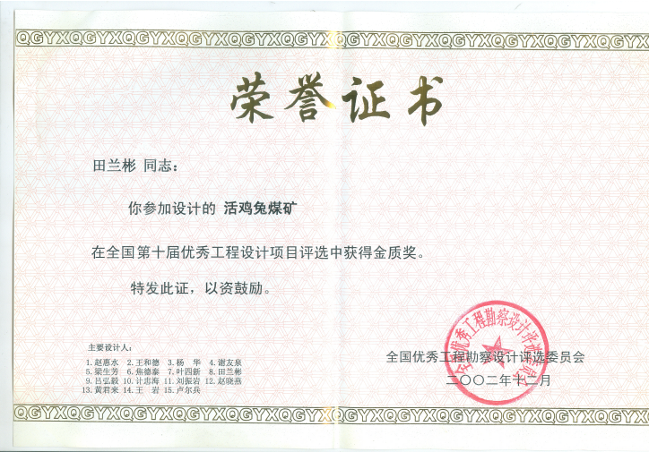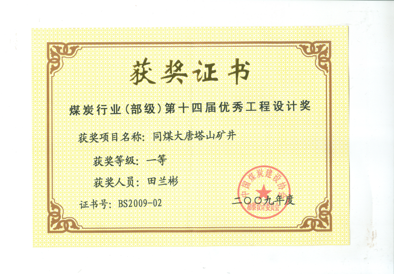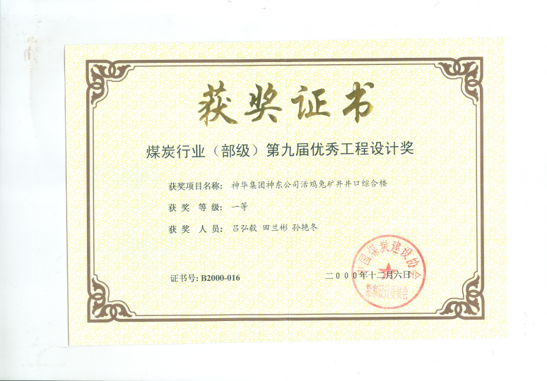在矿井办公楼设计方面,首次提出了将矿办公楼、任务交代室、灯房、浴室、主、副井井口房、无轨胶轮车库、材料库等合建在一个综合楼内的方案,解决了用地紧张、材料、汽车等10多种不同活荷栽取值对结构计算的影响等问题。完成了国内第一座多功能现代化的矿井综合楼设计。获得煤炭行业(部级)第九届优秀工程设计一等奖。同时该工程的建成使用也为矿井被评为全国第十届优秀工程设计金奖、煤炭行业(部级)第十届优秀工程设计一等奖做作出了贡献。