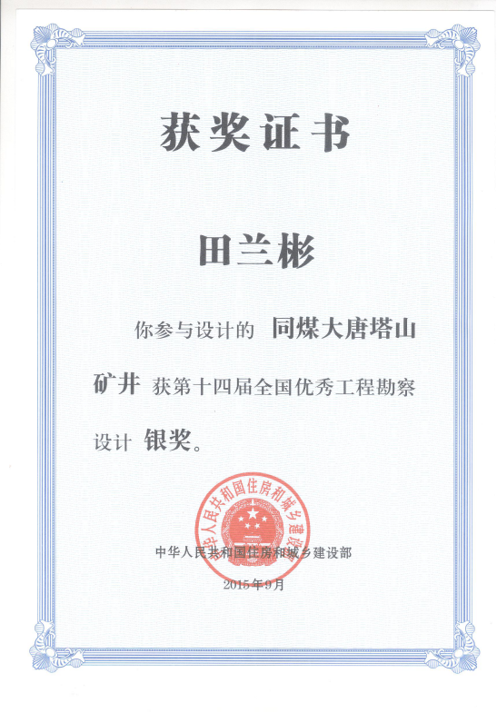 田兰彬,男,山东定陶人,煤炭行业设计大师,教授级高工,北京华宇工程有限公司,副总工程师,中国煤炭工业技术委员会委员,中国工程建设标准化协会贮藏构筑物专业委员会委员。中国煤炭建设协会建筑结构专业资深专家。财政部、北京市评标专家库专家。国家一级注册结构工程师、国家注册咨询工程师、监理工程师。曾获国家科技能源科技进步二等奖1项,全国优秀工程设计金奖1项、银奖1项。中国煤炭工业协会科学技术三等奖1项。煤炭行业(部级)优秀工程咨询成果特等奖1项、二等奖1项、三等奖1项,优秀工程设计一等奖4项,二等奖3项、三等奖4项。发表论文6篇。