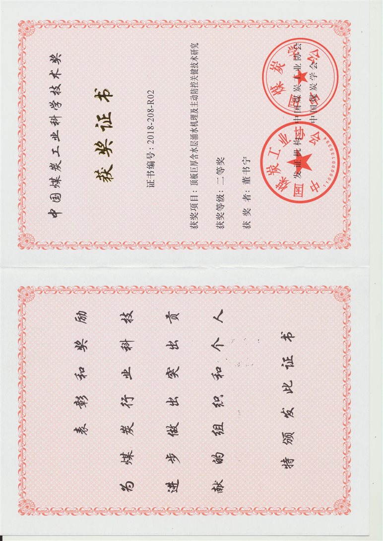 17.2018年中国煤炭工业科学技术二等奖--顶板巨厚含水层涌水机理及主动防控关键技术研究,排名第2;