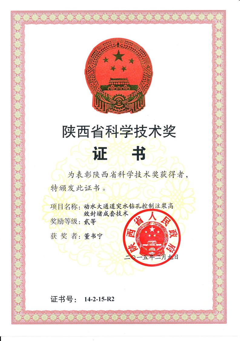 11.2014年中国煤炭工业科学技术一等奖--动水大通道突水钻孔控制注浆高效封堵成套技术,排名第2;