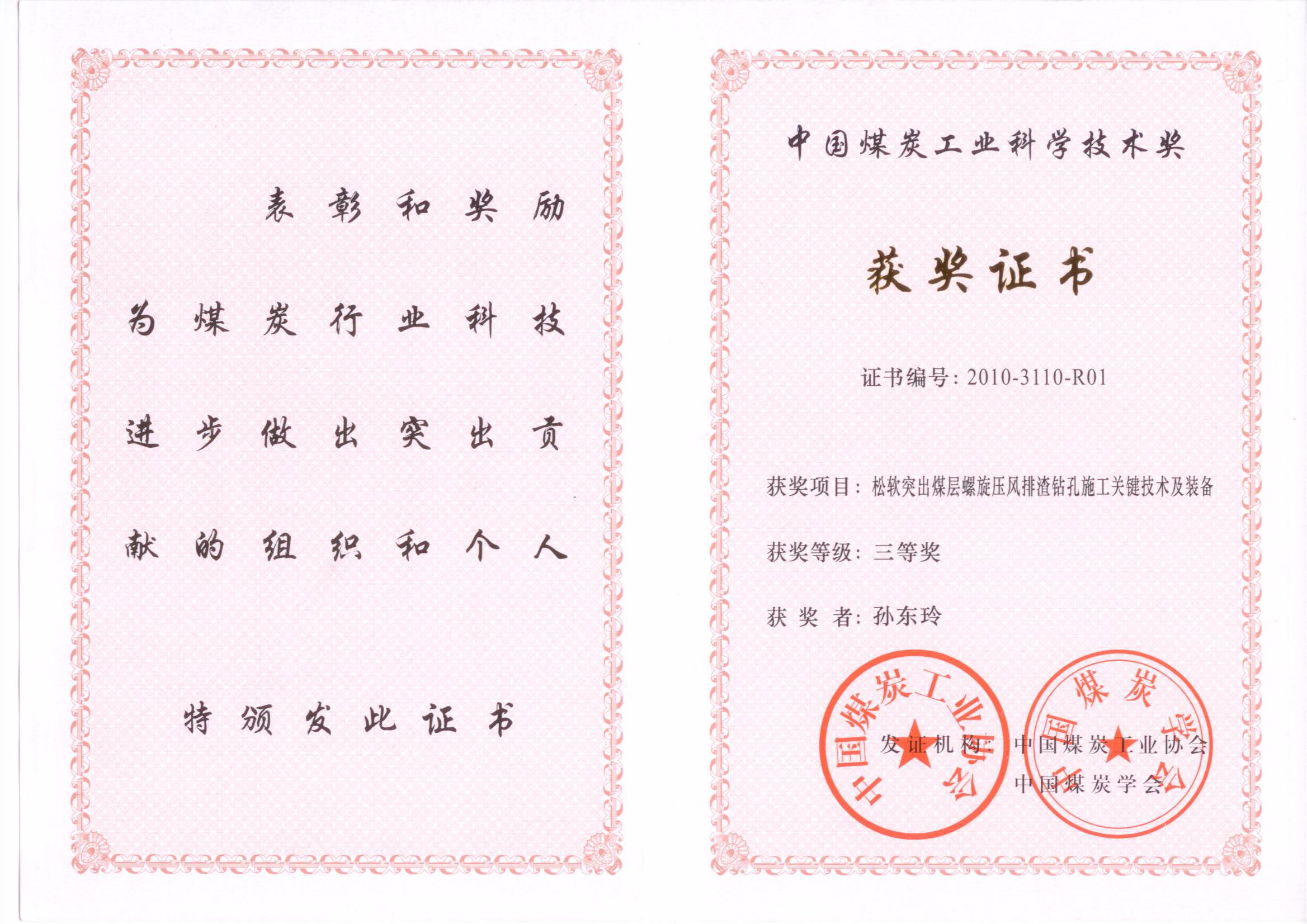 [12]2010年“松软突出煤层螺旋压风排渣钻孔施工关键技术及装备”获中国煤炭工业科学技术奖三等奖