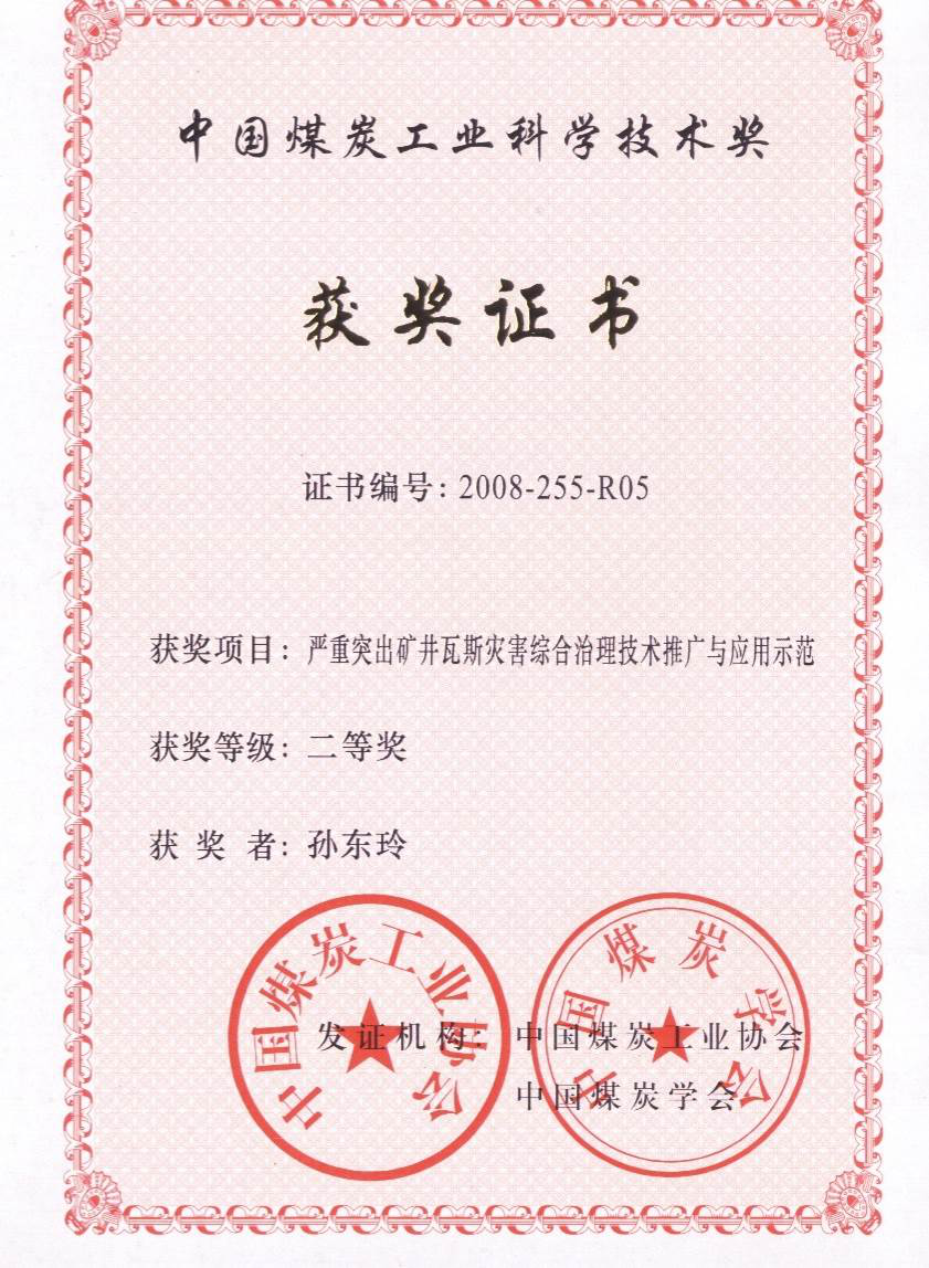 [11] 2008年“严重突出矿井瓦斯灾害综合治理技术推广与应用示范”获中国煤炭工业科学技术奖二等奖