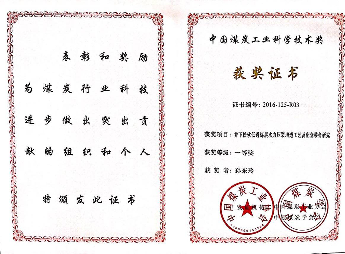 [2]2016年“井下松软低透煤层水力压裂增透工艺及配套装备研究”获中国煤炭工业科学技术奖一等奖