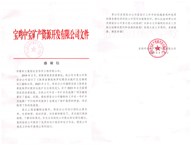 近日,由北京华宇编制的《中宝一号矿井及选煤厂可行性研究报告》顺利通过徐矿集团审查,项目取得了阶段性进展,建设单位宝鸡中宝矿产资源开发有限公司发来感谢信,对公司的先进的设计理念、优质的服务模式表示感谢,对参与文件编制的相关人员致以诚挚的慰问和崇高的敬意。