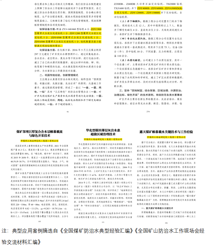 西安研究院自主研制生产的ZDY4500、ZDY6500、ZDY12000S、ZDY15000S等钻机在长治王庄煤业和淮南矿业(集团)有限责任公司等地的煤矿水害防治工作中,表现突出;配合煤矿深埋巨厚复合含水层帷幕截流与绿色开采技术、华北型煤田薄层灰岩水患超前区域治理技术、露天煤矿帷幕截水关键技术等7项治理技术应用实例入选汇编材料中。