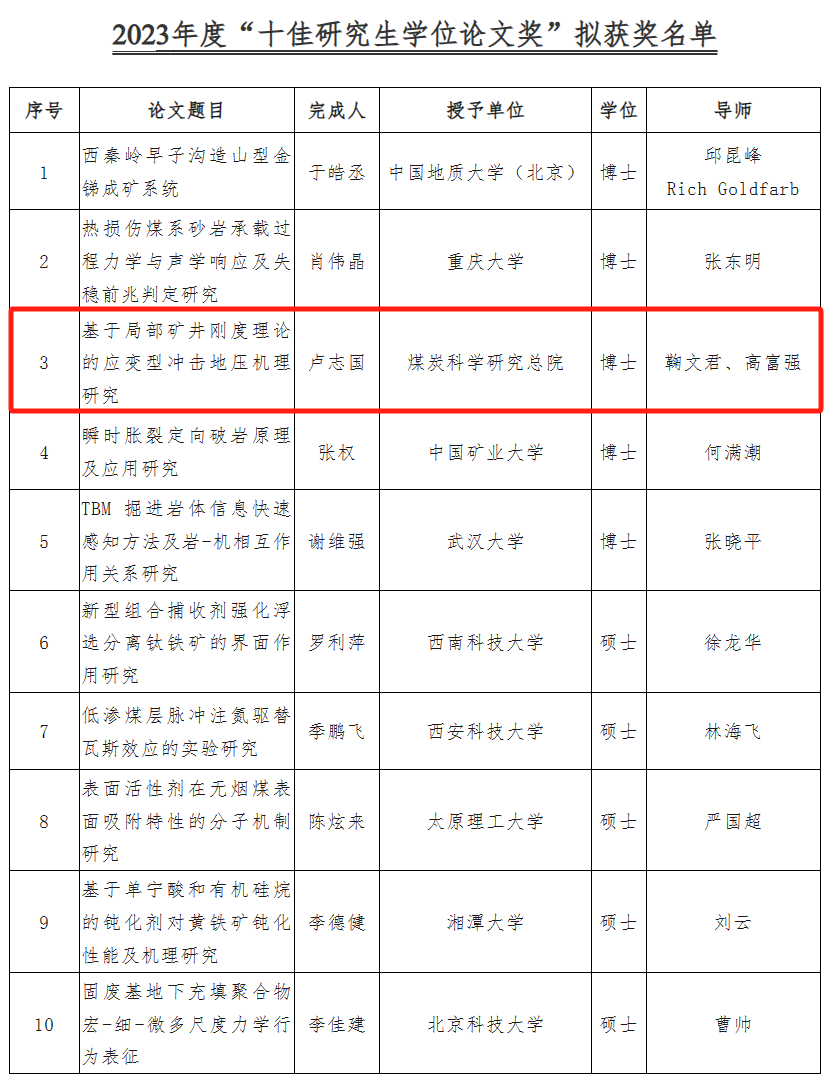 近日,中关村绿色矿山产业联盟组织的2023年度绿色矿山科学技术奖“十佳研究生优秀学位论文奖”评审结果揭晓,鞠文君研究员和高富强研究员共同指导卢志国完成的博士学位论文《基于局部矿井刚度理论的应变型冲击地压机理研究》成功入选。